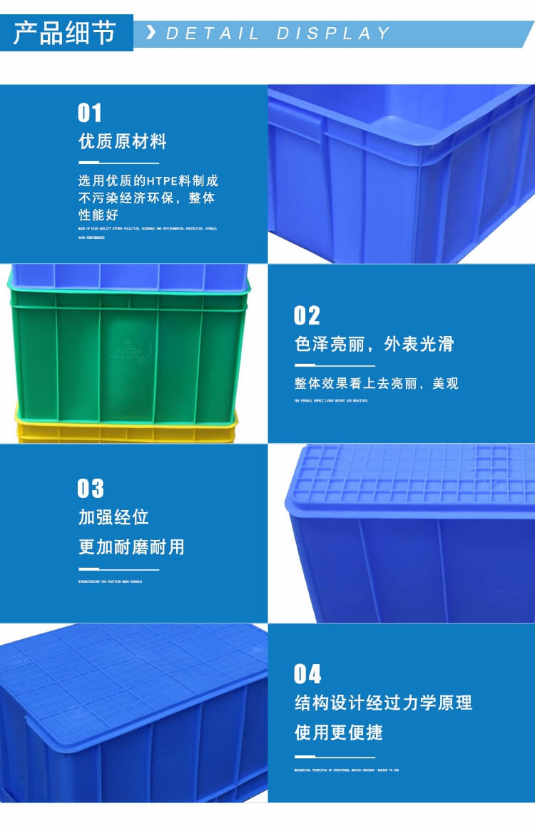 塑料周转箱适用于服装、五金、机械、电子、化工、仪表、养殖业、食品、水产、物流仓储等行业,可用于盛放食品,清洁方便,零件周转便捷、堆放整齐,便于管理。其合理的设计,优良的品质,适用于工厂物流中的运输、配送、储存、流通加工等环节。