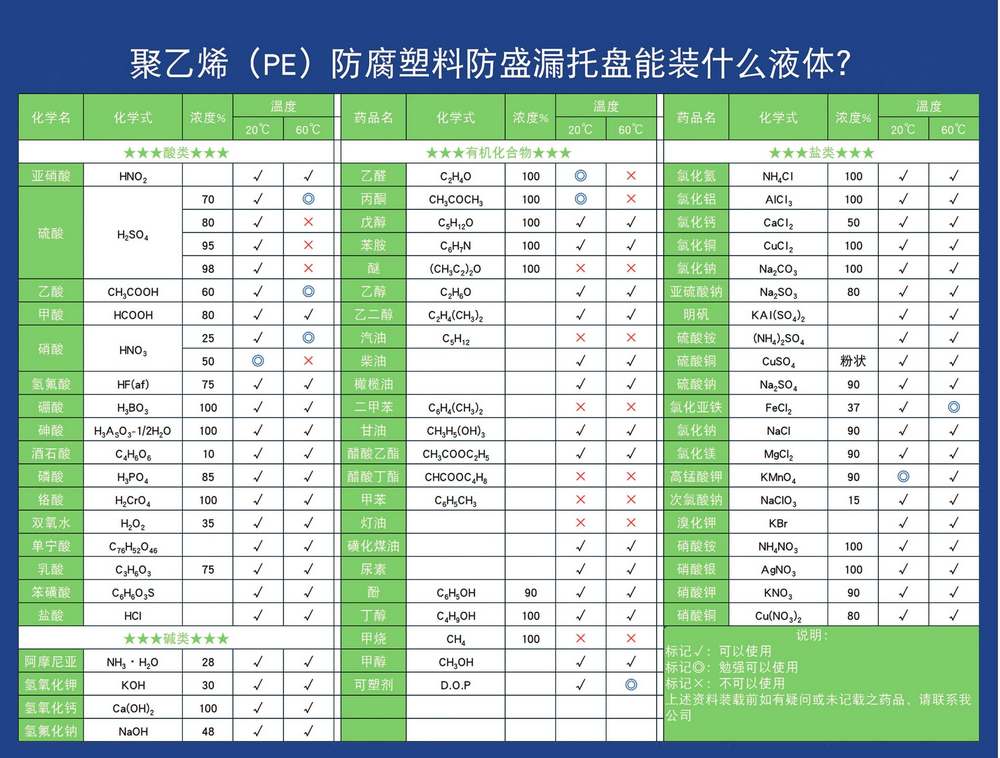 防泄漏托盘是使用纯原料聚乙烯HDPE注塑而成,原料PE是一种结晶度高,非极性的热塑性塑料,具有良好的耐高低温,耐酸碱,耐腐蚀的特性,这种材质常用与制造塑料包装制品。
