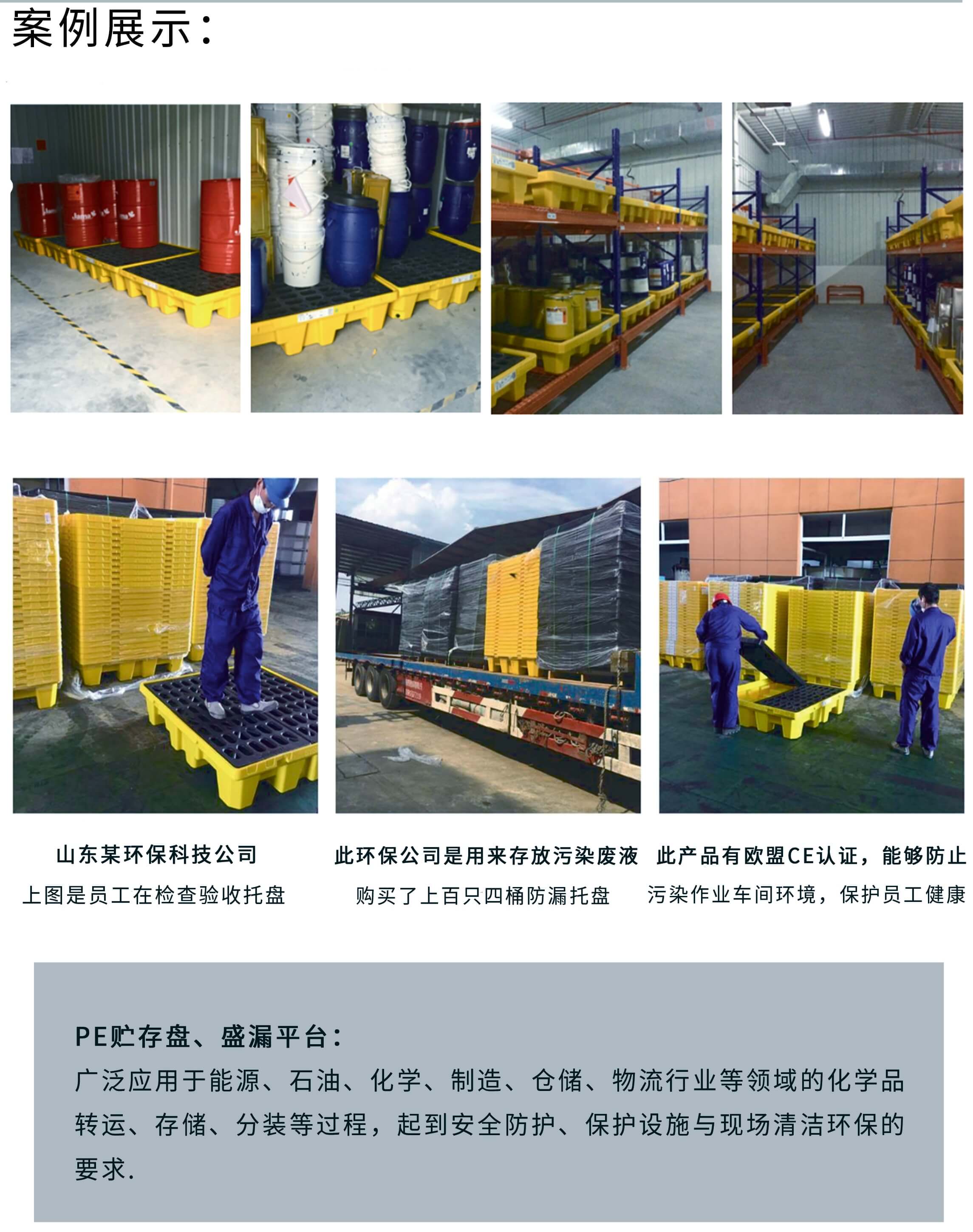 选择使用防渗漏塑料托盘的目的是为了防止油品,化学品和危险液态品在存储以及分装的过程中发生的泄漏而造成操作人员的人身伤害以及泄漏造成的环境污染。通过使用这种能盛装泄漏出来的液体的托盘,得到一个干净、卫生、安全的工作环境,不仅保护操作人安全,还能有效的防止环境污染,符合环保要求。